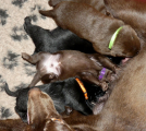 Hvalpene er rigtig store fra fødslen og de var alle i fuld gang med det samme. En nyfødt hvalp skal kun have ét mål - at finde en pat og spise. Og det levede alle 6 hvalpe op til i allerhøjeste grad.