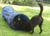 Tante Passja tager dem med ud i hvalpegården og for første gang kommer de ud i den nye indhegning på græsplænen. Det synes de er rigtig spændende og tante Passja viser dem, hvordan man bruger en tunnel.