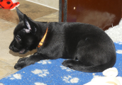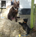 Vores kelpie Spezi, som er 7 år vil gerne opdrage Mezzo, det er nok en slags magtkamp mellem hanhundene, men det er ikke noget større problem, for Mezzo giver efter.