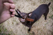 I vardagen behöver man en stor portion humor när man har två kelpies (Midori bor ihop med Valle som är en WK på sex år, och Mårran, en 14-årig blandrastant). Det händer alltid grejer! Hon är precis som jag vill ha henne - frimodig, gott självförtroende, påhittig, oerhört förig. Hon går för det mesta lös under våra promenader, och har alltid ett öga på var jag finns. Ofta försöker hon få igång lek eller träning, genom att dra i mina skosnören, kasta pinnar på mig, eller helt enkelt gå fot tills jag inte längre kan motstå hennes "kelpiesmile".
