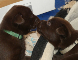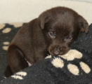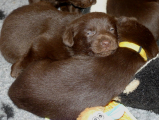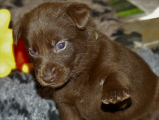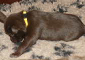2 uger gamle, øjnene er begyndt at åbne sig og hvalpene kan futte rundt i kassen i ret god fart. Ind i mellem kan man se luft mellem maven og tæppet, så de får flere og flere kræfter.