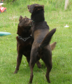 Hver aften laver vi "Pas de deu" i gården, det vil sige en hund til venstre, en til højre og så træner vi bare løs. Sit, dæk, stå, både frem og tilbage, drejninger i forskellige retninger, det er så sjovt, og begge hunde arbejder med stor iver.
