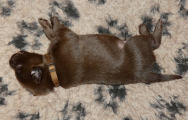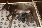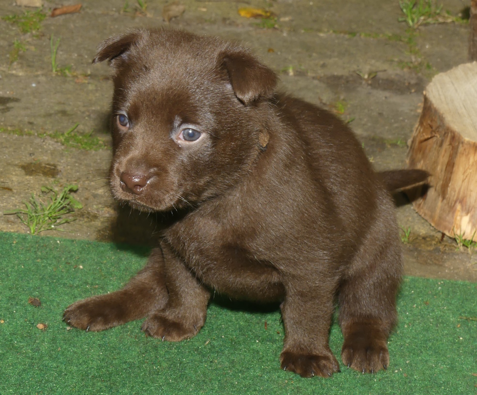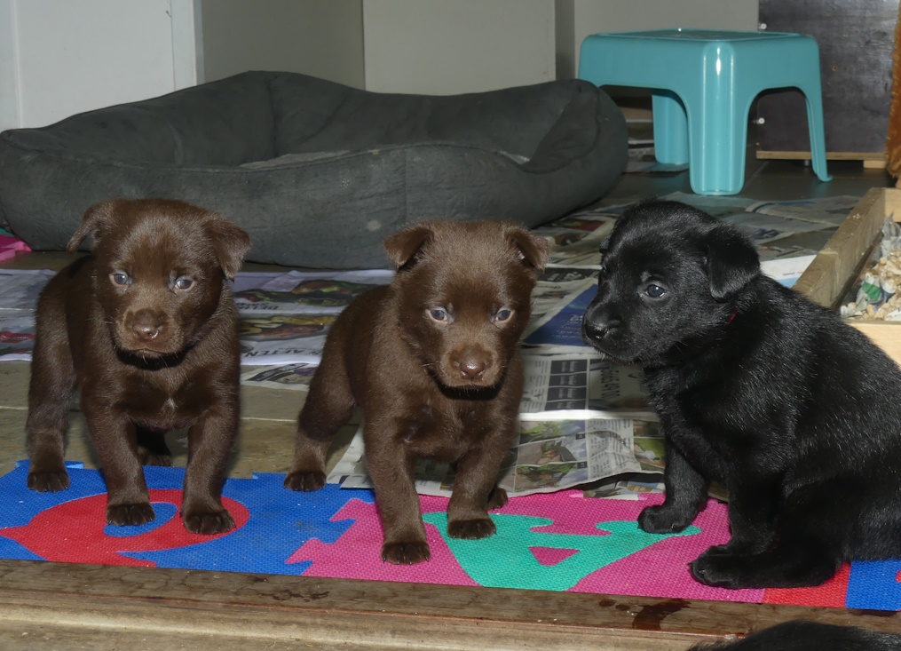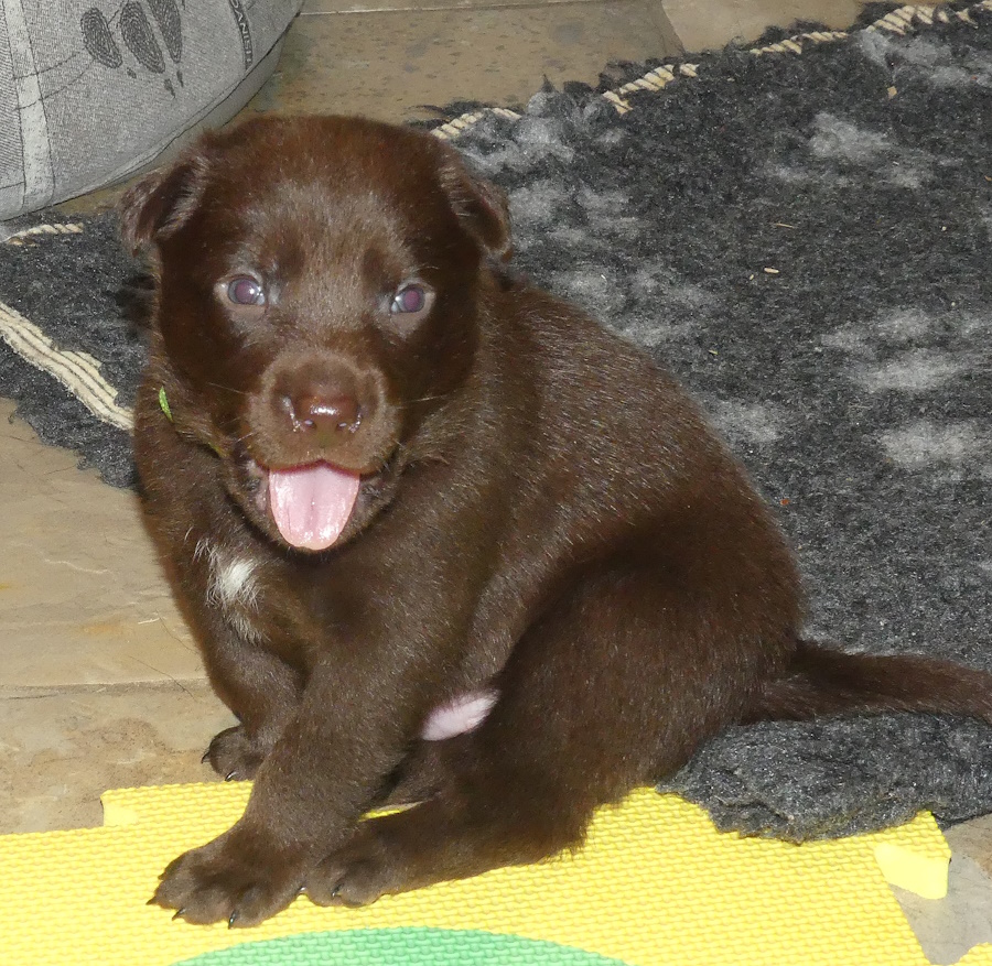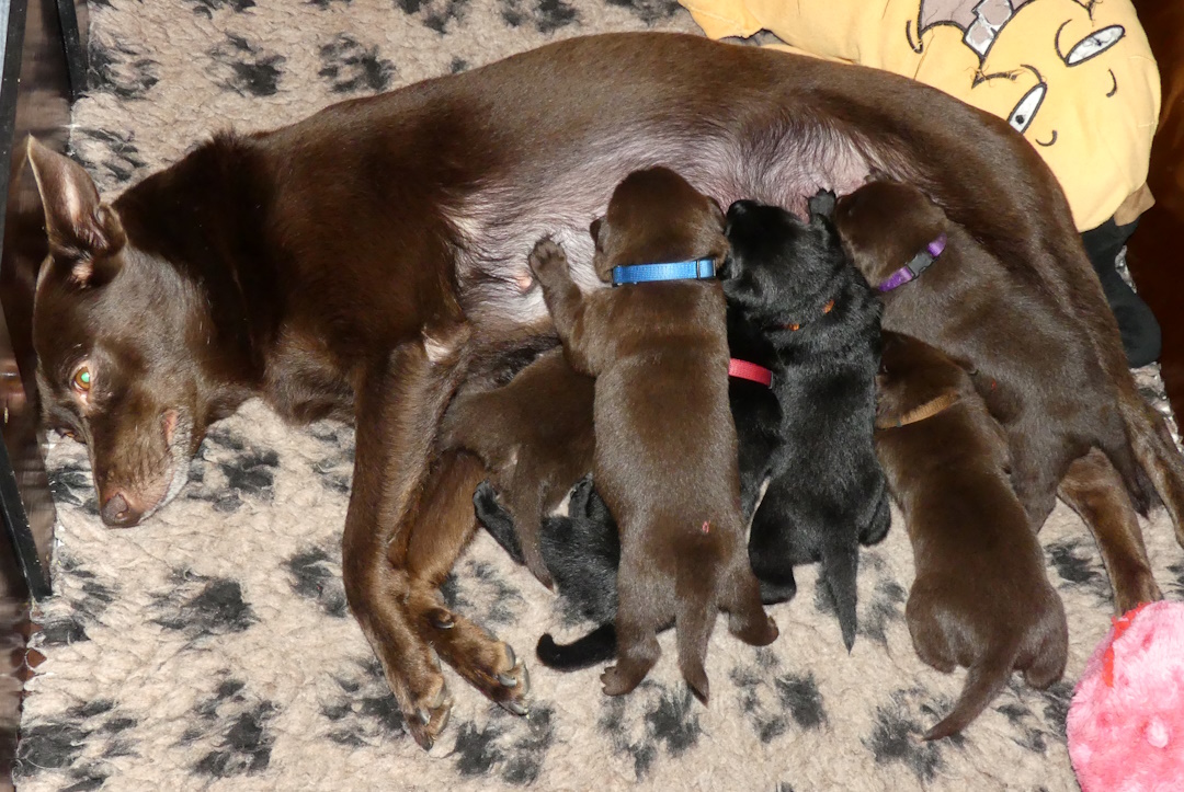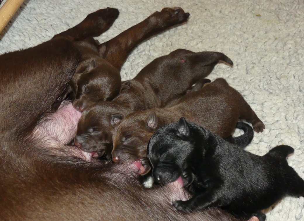 Brownie spiser som en havnearbejder, men hun ser stadig ok ud og hun kan tilsyneladende følge med med mælk endnu. Hun er rigtig glad for sine hvalpe og ligger rigtig meget ude ved dem. Ikke altid i kassen, for hvis hun bliver opdaget, så er der straks en eller flere hvalpe der finder frem til mælkekilderne.