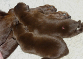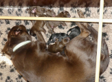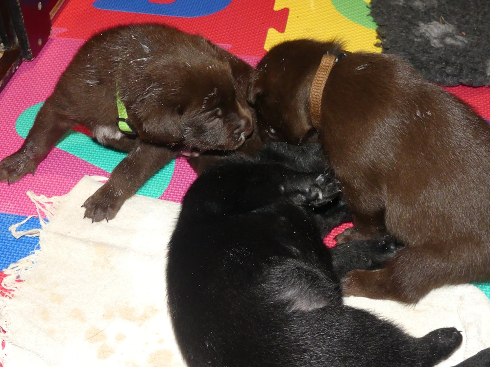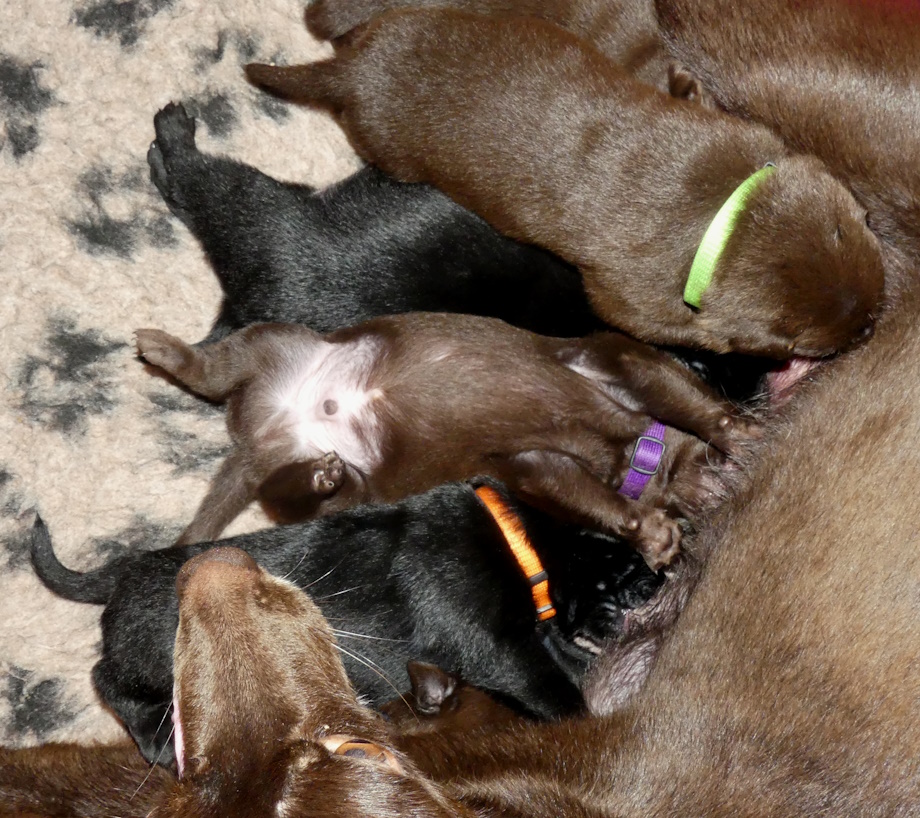 Hvalpene spiser og spiser og de tager vildt meget på. De har åbenbart besluttet sig til, at de skal blive store og tykke så hurtigt som muligt :-) Brownie har det godt, hun kan følge med at levere de mængder mælk, som hvalpene kræver.