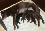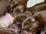 Hvalpene har fuldt fokus på mor Brownie, så snart hun kommer op i kassen og de begynder at være vågne lidt tid, også når de ikke spiser.
