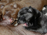 Hvalpene er rigtig store fra fødslen og de var alle i fuld gang med det samme. En nyfødt hvalp skal kun have ét mål - at finde en pat og spise. Og det levede alle 6 hvalpe op til i allerhøjeste grad.