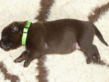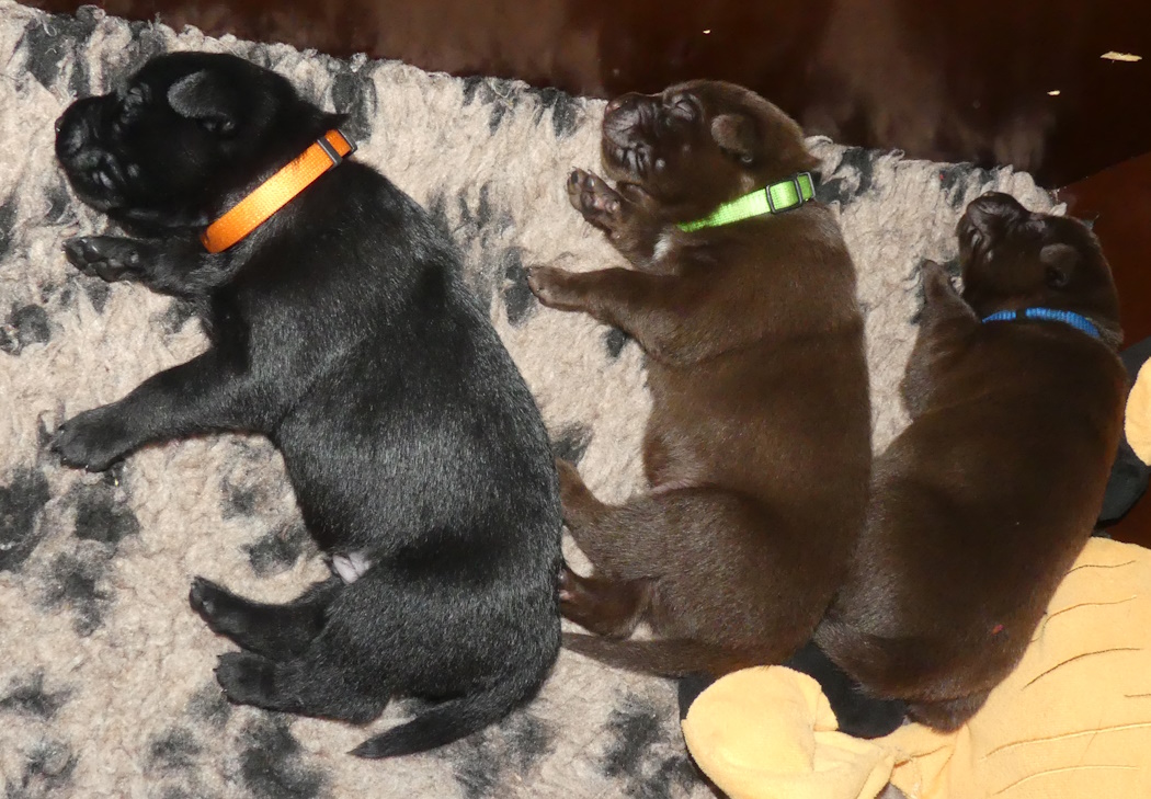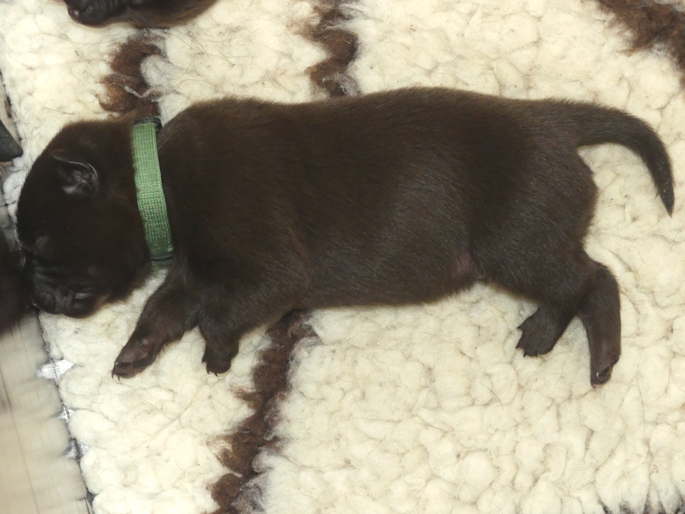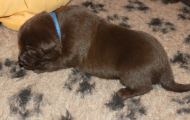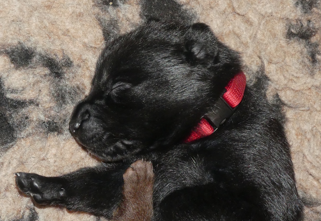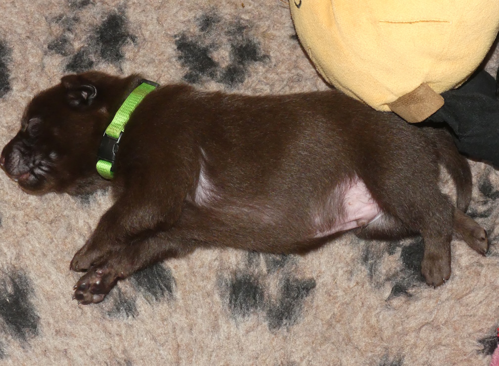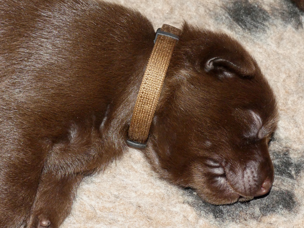 Her på kennelen får hvalpene halsbånd på, når de vejer 700 gram. 2 gange før, har 3 hvalpe nået denne vægt på 1 uge, men i dette kuld er alle 6 nået over 700 gram, 2 af dem er endda nået op over 800 gram.