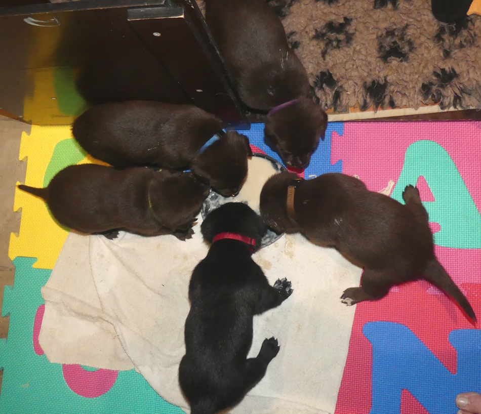 Det er altid spændende med de første måltider, om hvalpene kan finde ud af at spise, men det er gået supernemt. Kun en enkelt af dem har haft lidt svært ved at spise selv. Det er nogel friske og fremmelige drenge, men Hailey (den enlige pige), hun forstår at spise mad. På 2 dage med ekstra mad har hun genindtaget sin position som den største af hvalpene.