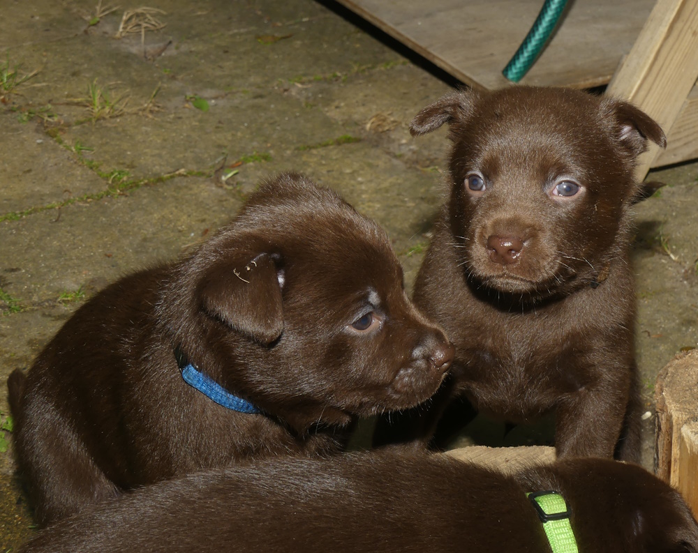 Hvalpen med mørkegrønt halsbånd har fået brunt halsbånd i stedet. De to grønne var svære at se forskel på i video og på billeder.