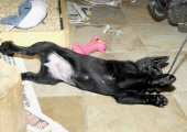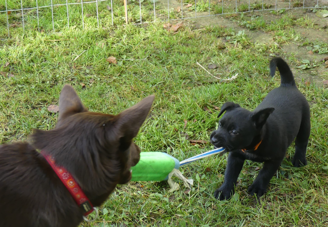 Vores kelpie Spezi, som er 7 år vil gerne opdrage Mezzo, det er nok en slags magtkamp mellem hanhundene, men det er ikke noget større problem, for Mezzo giver efter.