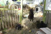 Jeg får åbnet lidt af hvalpegården ved at flytte halmbundterne lidt væk. På den måde kan hvalpene selv løbe ud i haven og de kan komme med, når jeg går rundt og rydder op.