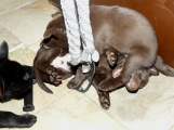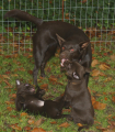 Hvalpene hygger om morgenen og så kommer tante Passja og vil også være med. Passja er virkelig sød ved hvalpene, meen hun er jo bare selv en hvalp ...