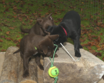 Hvalpene er begyndt at lege rigtig meget med hinanden nu, og de hygger sig rigtig meget sammen.